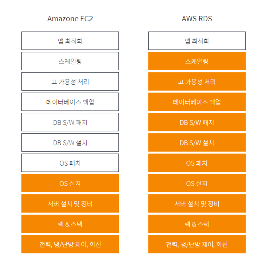 RDS는 대행업체이다. RDS를 사용하면 서버 관리를 걱정할 필요가 없다. AWS가 백업 및 업데이트와 같은 모든 일상적인 작업을 처리하기 때문이다. 다만 이는 당연히 모든 것을 대행해서 해주기 때문에 비용이 더 비싸다.