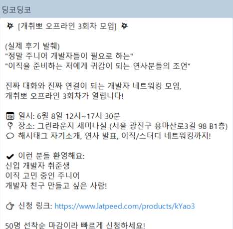 가장 놀랐던 건 개취뽀 운영진 중에 금오공대 졸업하신 18학번 선배님이 계셔서 깜짝 놀랐어요! 세상 역시 좁더라고요..! 선배님께 여러 조언도 얻고, 나중에 연락하면 도움 주신다고 하셔서 정말 감사했어요. 저도 나중에 성공해서 후배들을 잘 챙겨줘야겠다고 생각했답니다.