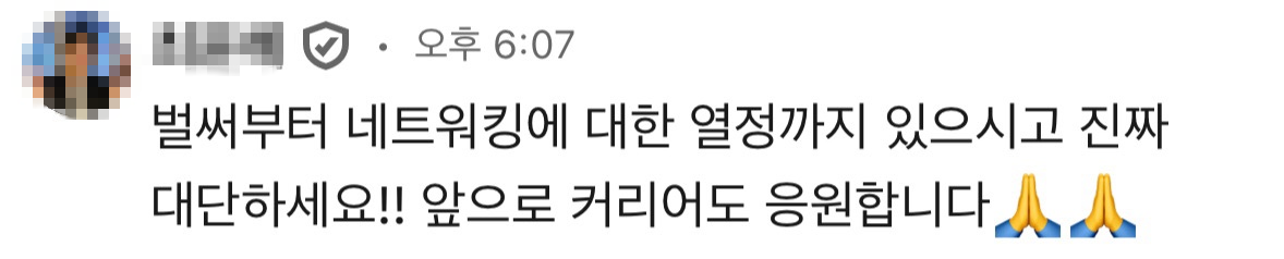 아직 대학교 3학년이고 시험기간일텐데 네트워킹 자리도 다녀오시고 열정이 대단하신 것 같아요!! 최근에 나태해졌던 제 자신을 반성하게 되는 좋은 글인 것 같습니다