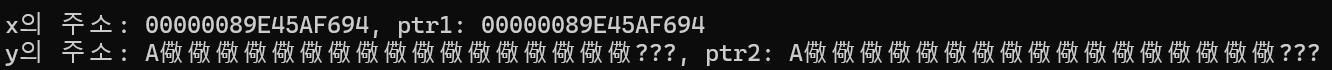 cout << "y의 주소: " << (void*)&y << ", ptr2: " << (void*)ptr2 << endl;