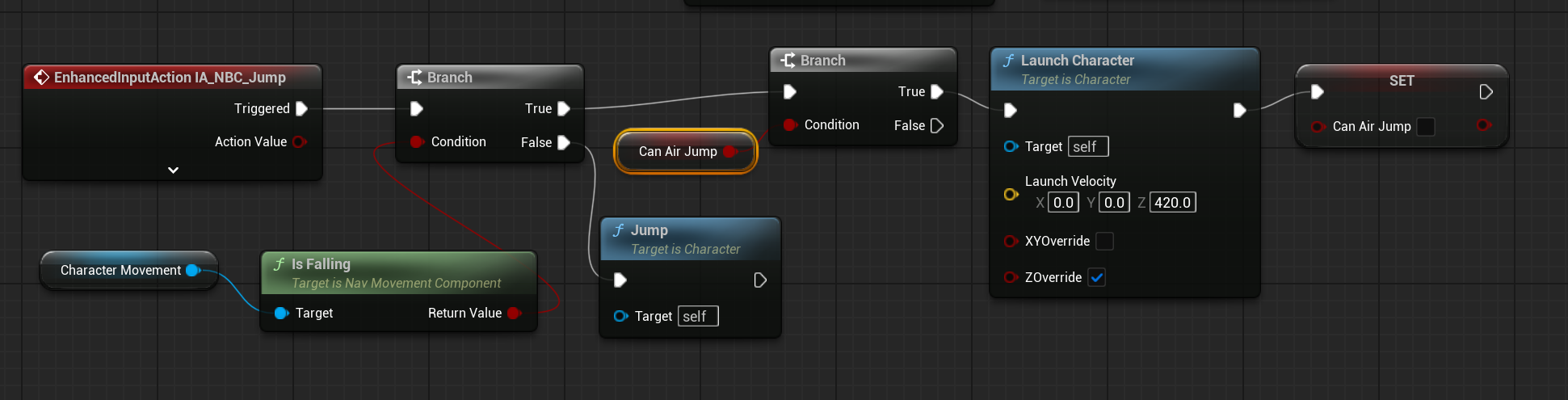 - 점프중이거나 떨어질때 점프를 하면 분기를 타고 can air jump가 true인지 확인한다.(오브를 먹었는지 확인) 오브를 먹었다면 z축으로 420만큼 점프시켜주고 can air jump를 false로 초기화 해준다.