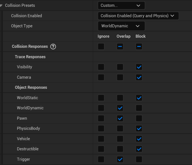 collision preset을 custom으로 하고, pawn과 worlddynamic을 overlap으로 변경하고 실험해보았다.