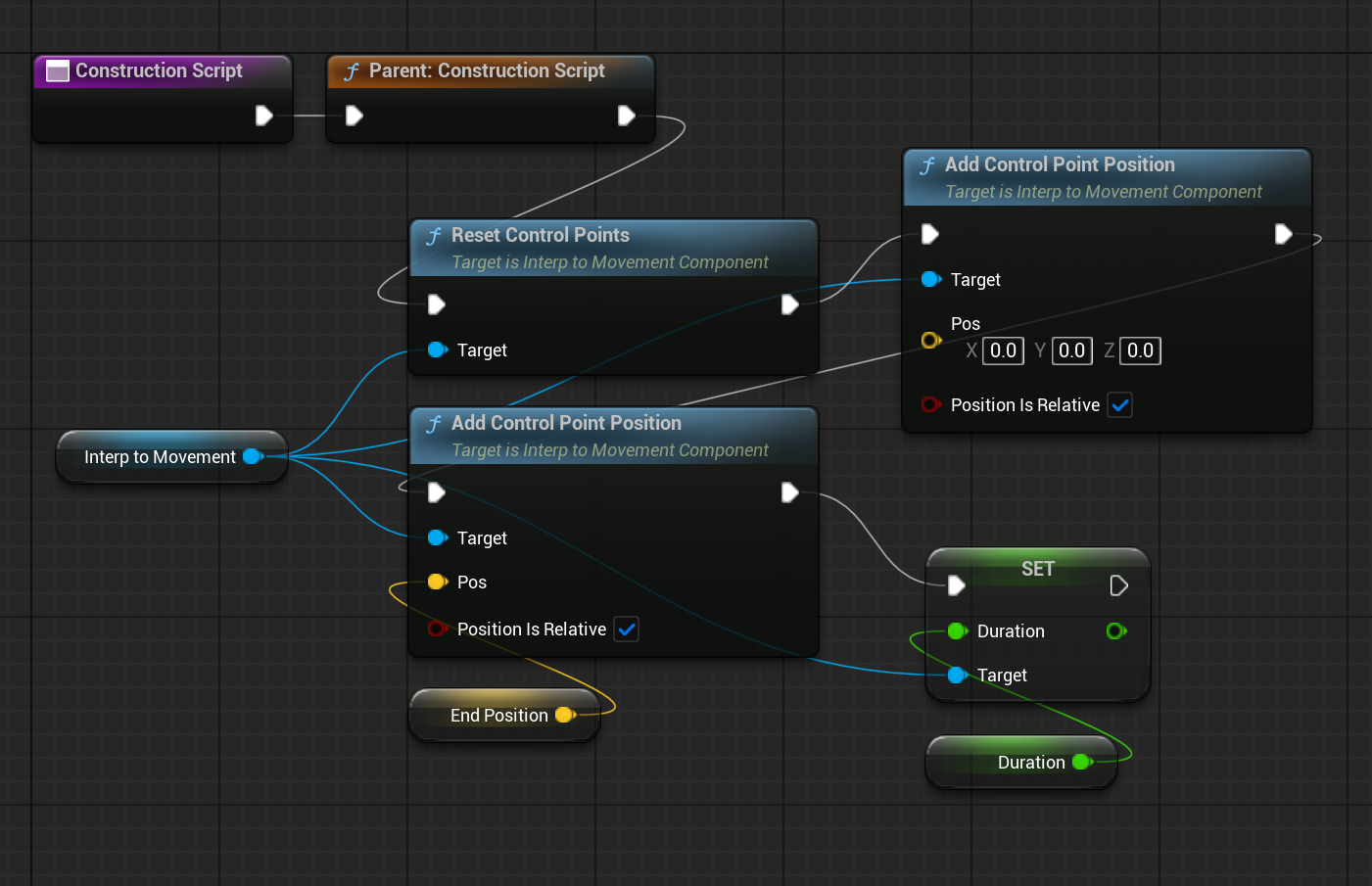 우선 EndPosition(Vector), Duration(Float)이라는 변수를 만들고 EventGraph옆에 Construction Script탭으로 들어갔다.