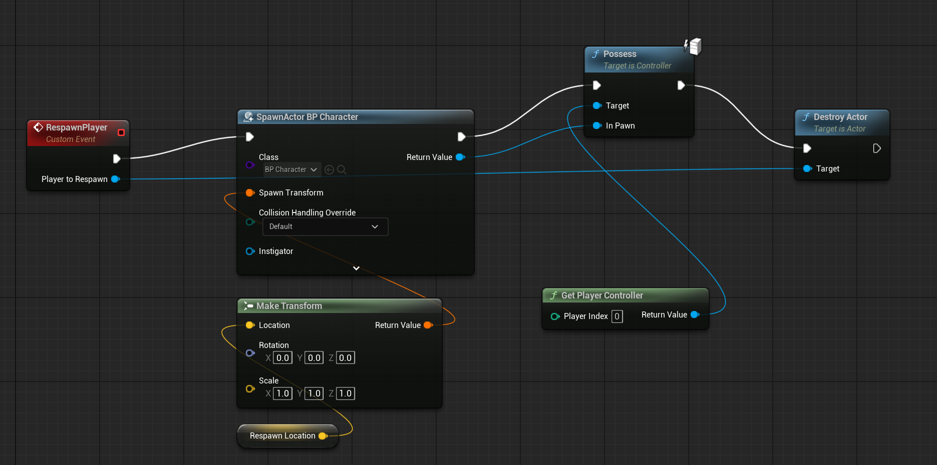 - SpawnActor BP Character를 만들어서 리스폰할 위치를 지정하고, possess에 get palyer controller연결해서 조종할 수 있게 했다.
