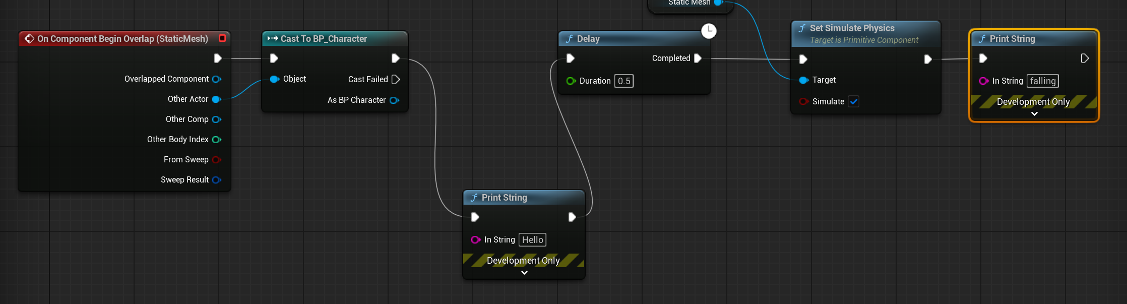 - 평소처럼 beginoverlap 이벤트를 사용했고 테스트를 해보았는데 캐릭터가 착지해도 print string이 동작하지 않았다.