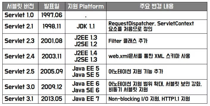 - 그리고 이 기술은 1997년 6월에 Servlet 1.0을 공식 발표하면서 Java EE의 제품화에 포함되었다.