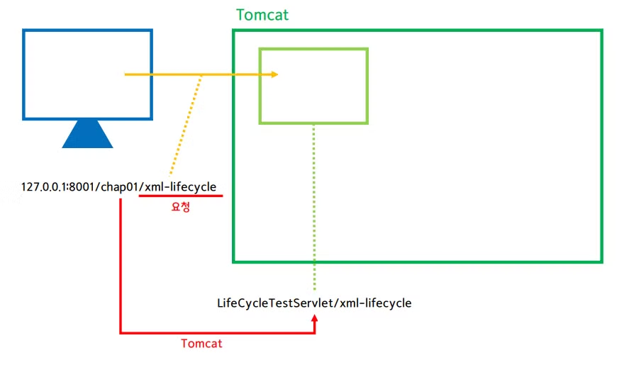 - 클라이언트가 서블릿의 url로 요청을 보내면, 톰캣이 이를 해석해 매핑된 서블릿으로 연결하는 구조이다.