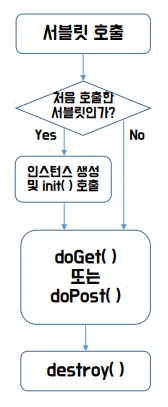 - 이후 작업이 실행 될 때마다 service() 메소드가 요청한 HTTP Type에 따라 doGet(), doPost() method를 호출한다.