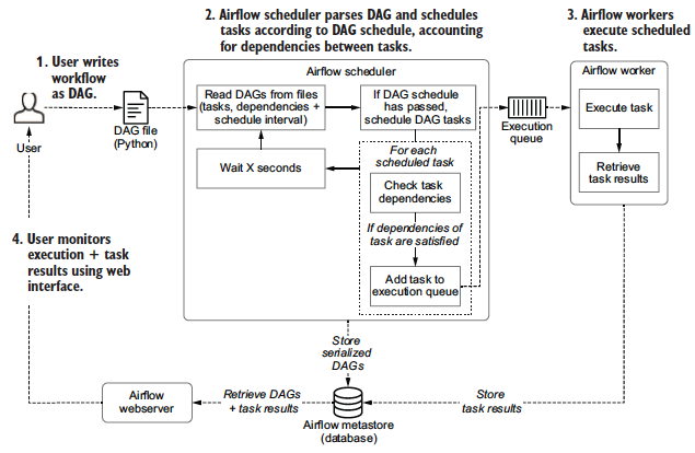 (3) (if the DAGs’ schedule has passed) starts scheduling the DAGs’ tasks for execution by passing them to the Airflow workers.