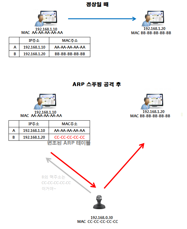 ARP 테이블에서 게이트웨이의 MAC 주소를 공격자 컴퓨터의 MAC 주소로 바꾸게 된다.