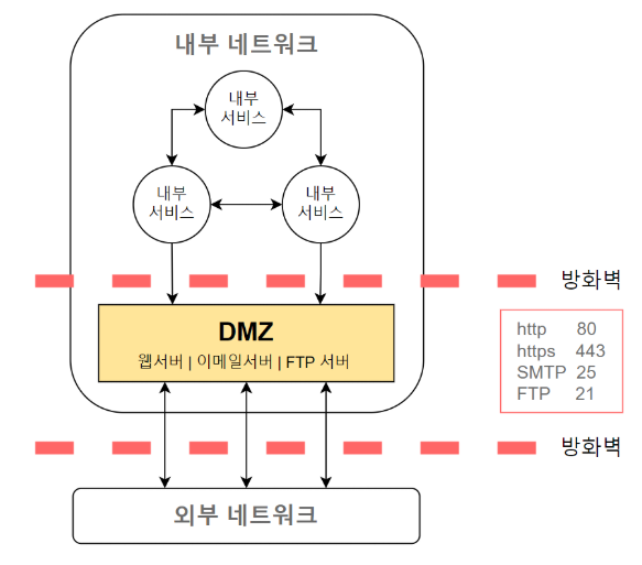 DMZ는 외부 네트워크와 내부 네트워크 사이에서 외부 네트워크 서비스를 제공하면서