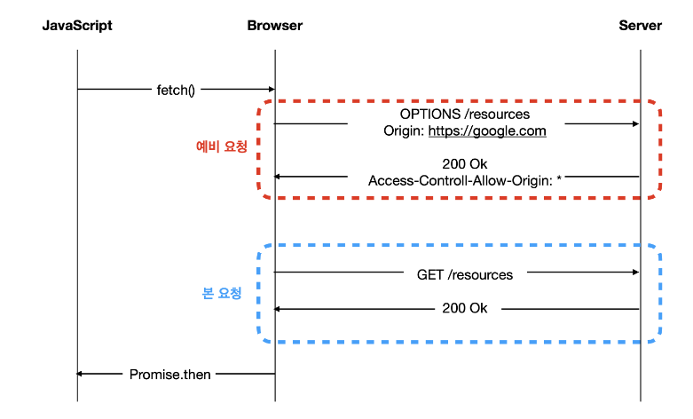 이후 브라우저는 예비 요청과 서버의 응답에 담긴 정책을 비교하여 안전하다고 판단되면, 같은 엔드포인트로 다시 본 요청을 보내게 된다. 그리고 서버가 본 요청에 응답을 하면 브라우저는 최종적으로 응답 데이터를 자바스크립트에 넘겨준다.