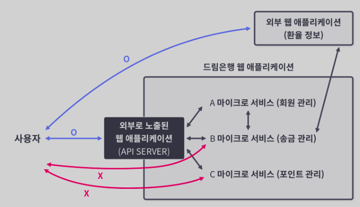 각각의 ABC 마이크로 서비스는 서버 내부망에 속해있으며, 외부에서는 접근할 수 없다.
