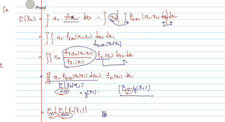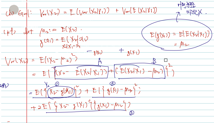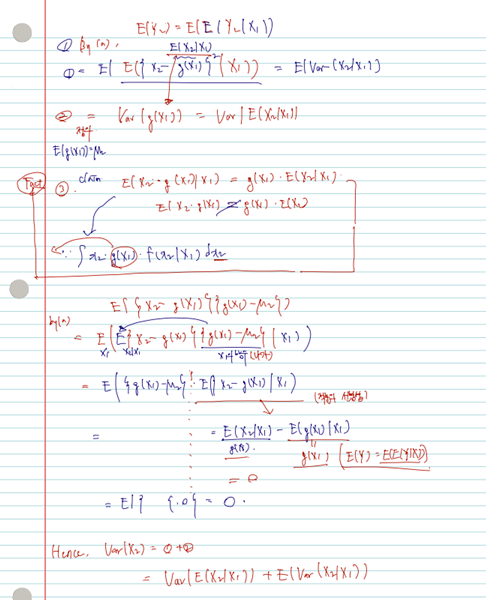증명의 호흡이 길 순 있으나, 조건부 기댓값/분산의 정의, 어떤 변수에 대한 적분인지, 적분의 선형성 등만 익히고 있다면 아주 재미나게 증명할 수 있다. 아, 또한 given X1=x1일 때 X2의 expectation 은 g(x1) 함수로 볼 수 있다는 사실도 기억해두자.