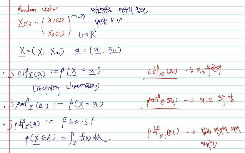 - random vector 에서의 정의는, X가 X가 되어 radom vector 가 된다는 점, R가 높아진 dimension 에서 R2가 된다는 점 이외에 특별한 차이가 없다.
