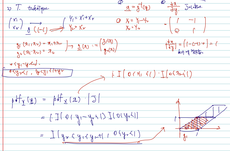 앞서서는 bivariate r.v.의 transformation expectation 을 살펴봤다면, 이제는 pdf를 구할 수 있다. joint 라고 pdf 를 구하는 것이 다르지는 않으며, 1. g(X1, X2) = Y라 할 때 Y의 cdf 를 구한 후 미분하거나 2. transformation techniques 아래를 쓴다.