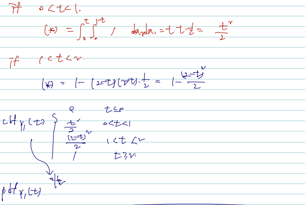 다음과 joint pdf 가 주어졌을 때 marginal cdf 를 구하는 것을 구하는 일반적인 방법은 joint pdf 를 서로 다른 두 변수에 대해 적분하거나, marginal pdf 를 구하고 단변량 적분을 하는 것이다. 그러나 여기서는 어느 방법을 택하든 결국은 marginal 을 구해서 관심 대상이 아닌 변수를 모든 부분에서 적분하여 값을 얻을 수 있음을 기억하자.