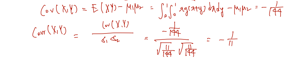이 문제에선 joint pdf 가 x+y로 대칭의 형태를 이루고 있으므로, X에 대해 분산과 평균을 구했다면 이를 Y에 대한 상황에서도 동일하다고 보면 쉽다.