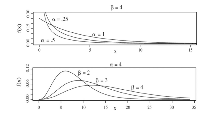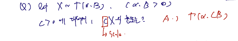 감마분포의 모수가 되는 알파는 shape 파라미터, 베타는 scale 파라미터라 불린다. 특히 감마분포 pdf 는 exponential 함수에 depend 하는 베타에 영향을 많이 받는데, 베타 값이 커질수록 그래프를 양옆으로 찢는 형태가 되며, 이를 x에 붙어 scale 을 조절한다 하여 scale 파라미터라 부른다.