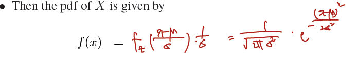해석을 굳이 덧붙이면, std.normal pdf를 μ 만큼 평행이동하고 σ만큼 잡아당긴 것과 같다. 따라서 X∼N(μ,σ2) 와 같이 쓴다.