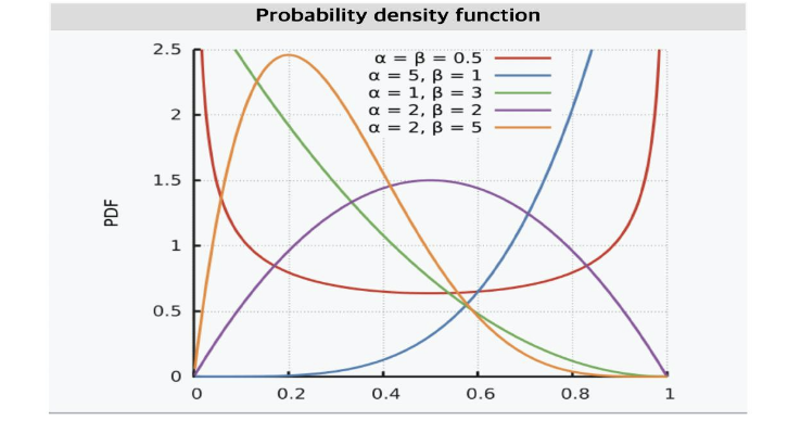 베타분포는 다음과 같이 정의할 수 있다. 파라미터 알파, 베타 >0 가 있을 때, pdf 는 다음과 같다.