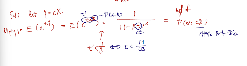 mgf 원래 식에 t대신 tc 를 scala 로 볼 수 있으므로 이 자리를 채운다고 하면, C는 scale parameter 베타와 묶인다. 이 문제역시 감마분포가 r/2, 2 를 모수로 하는 분포가 되는데 이건 카이제곱(r)의 분포와 같다. 따라서, 결론적으로 임의의 감마분포는 적당히 scale 변환 후 카이제곱분포로 변환이 가능함을 알 수 있다.