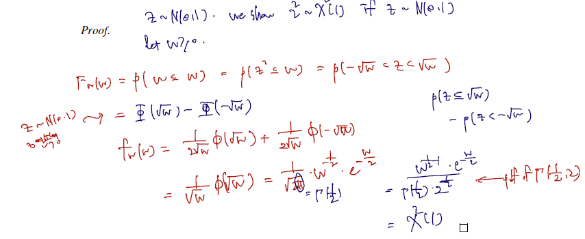 pdf of w가 카이제곱(1)과 같음이 증명되었다. w는 원래 z^2의 제곱과 같으므로 z^2이 카이제곱(1)과 같으을 보였다.