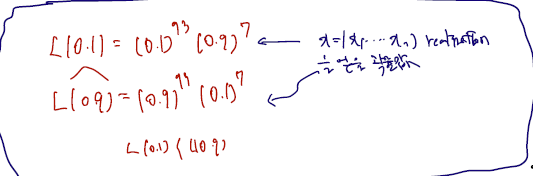 베르누이 분포를 따르는 확률 sample 들에 x라는 relization 들이 들어왔고, 여기에 0이 7개, 1이 93개인 상황이다. 여기서 likelihood (pmf 값)을 쓰면 다음과 같다. 여기서 likelihood 는 theta 가 true paramter일 때, X1...Xn 을 관찰하는 pmf 값으로 정의한다.