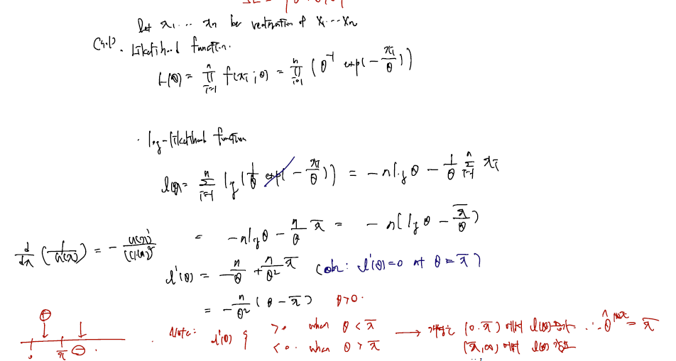 Example2. 미분 가능의 경우X1,…,Xn∼iidGamma(1,θ) with pdf f(x∣θ)=θ−1exp(−x/θ),x> 0 . Find the MLE of θ.
