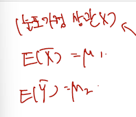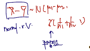 이번엔 아까와 다르게 서로 다른 확률 변수를 2개 두며, 각각 normal 을 따르지만 독립으로 다른 분포에서 iid로 추출했다고 가정한다. 여기서 추정하고 싶은 건, 두 확률변수의 모평균의 차에 관심을 가질 것이다. (약의 효과를 검증하는 실험에서 X는 진짜 약을 주고 진짜 약의 효과를 normal 을 따른다고 가정하고 측정하고, Y는 가짜 약을 줬을 때 그에 대한 차이를 비교해볼 수 있다.)