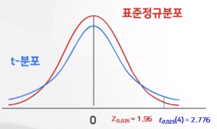 예를들어 같은 신뢰도 95% 를 유지하며 추정할 때, 1)의 z위치는 1.96 이고 2)에서는 2.776 이다. 왜 t분포를 가정했을 때 0으로부터 더 먼 곳에 신뢰도 95%로 만드는 점이 위치할까?