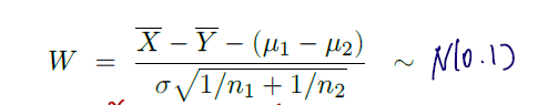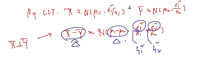 아까와 같이 large n일 때 모분산의 근사를 쓸 수 있고, CLT을 써서 n이 충분하게 주어질 때 이들의 차도 normal 을 따름을 보일 수 있다. 이를 다시 정리하면 다음과 같다.
