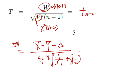 이제 마무리이다. 앞서 1. normal (0,1) 을 따르는 통계량 하나(W)를 만들었고, 2. 분산을 그대로 두지 않고 각각의 편차 제곱 평균으로 보아 카이제곱(n-2) 를 따르는 변수 V를 만들었다. 3. 이 W와 V는 표본평균과 표본분산에 depend 하는데, 이 둘은 indep 이다. (by student's theorem) 그럼 이걸 가지고 T를 쓸 수 있고, 이 T는 n-2 자유도의 t-distribution 을 따른다.