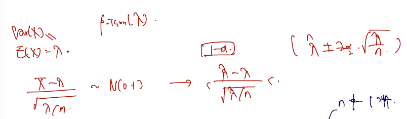 이는 근사신뢰구간 예제의 large sample asymptactic 사례에 속한다. 예를들어, X가 포아송 람다를 따르는 분포에서 추출되었을 때에도 true lambda 를 근사하여 신뢰구간을 쓸 수 있다. 휘갈겨 쓴 감이 있긴한데.. 아래와 같다!