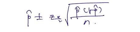 분모쪽의 p는 이후 근사신뢰구간에 들어가는 부분인데 알 수 없음이므로 여전히 표본비율 p 으로 근사한다. 이건 CLT를 쓴 건 아니고, 모비율을 n을 무한대로 보내면 표본비율로 근사할 수 있다는 fact 를 쓴 것이다.