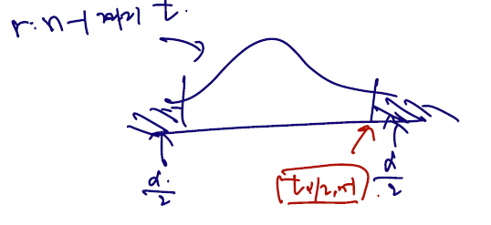 tα/2,n−1는 양쪽 꼬리를 다 더했을 때 확률 알파가 되게 하는 분포에서의 점이다. 그림으로는 다음과 같음.