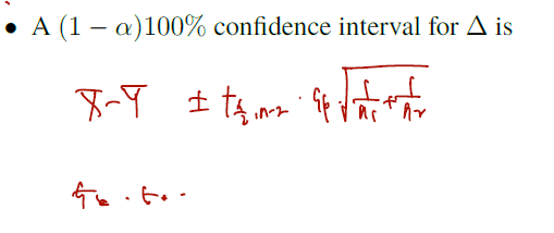 우리가 현재 풀고 있는 문제는 분산이 동일한 경우를 가정한다. 만약 분산이 다를 경우 X의 분산과 Y의 분산을 각각 더하는 식으로 편하게 썼겠지만.. 분산이 같다고 한다면? 더 많은 sample 로 더 정확한 분산을 계산할 수 있을 것이다. 이를 반영해서 pooled sample variance 를 쓴다.