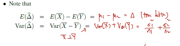 추정해야 할 것은 두 모평균의 차로 정의된 델타이고, 이걸 뭘로 추정할까.. 하면 역시 각 표본평균의 차가 가장 적절할 것이다. (=: 추정량)