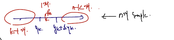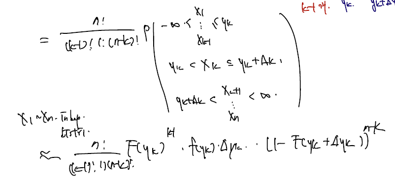 이 marginal pdf를 다시 유도할 것이다. 아래 그림에서 나타내듯, n개 sample 이 주어질 때 Yk 자체는 yk와 yk+ 증분. 사이에 위치한다. 그리고 k-1개는 yk 왼쪽에 위치한다. 나머지 n-k개는 오른쪽에 위치한다.
