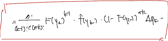 그러면.. pdf 는 일단 3가지 경우에서의 확률과 경우의 수의 곱일 것이다. 경우의 수는? 전체 n!을 각각 (k-1)!, 1!, (n-k)! 로 나눈 것이다. 여기에 확률변수가 들어갈 joint pdf 를 곱하면 다음과 같이 쓸 수 있다.