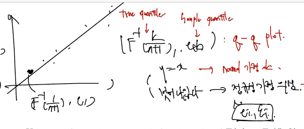 만약 sample quantile 과 true quantile 이 일치한다면 (샘플에서의 0.9위치한 점과 실제 cdf 에서 0.9 위치 점) 그래프가 y = x 로 그려질 것이고.. 그렇지 않다면 y = x 선에서 많이 벗어난 형태로 그려질 것이다.