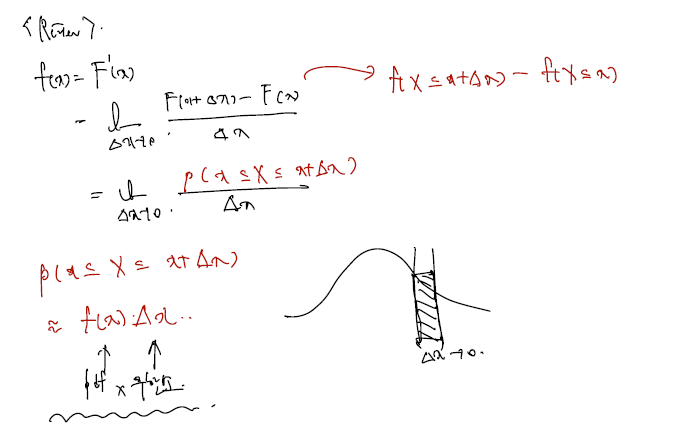 1)을 2)라고 쓸 수 있는 이유는 pdf 의 정의 때문이다. cdf 를 미분한 것이 (또는 적분할 때 들어가있는 form이) pdf 의 정의라 알고있고, 따라서 X가 x와 x + x증분으로 위치할 확률은 pdf 에 x무한소를 곱한 형태로 다시 쓸 수 있다.