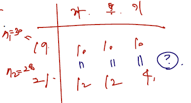 역시나 df 는 칸을 채우는 것에 지나지 않는다. 여기서도 마찬가지로, 귀무가설이 맞지 않을 때에서 맞을 때를 빼게 되는데, 맞지 않을 경우 전체 mk 칸 중 1칸만 제외하고 다 구해야 하지만 맞을 경우 독립으로 정의되는 각 칸을 채우기 위해 m-1칸 + n-1칸만 채우고 나머지는 다 곱으로 정의하면 된다.