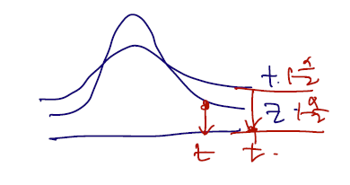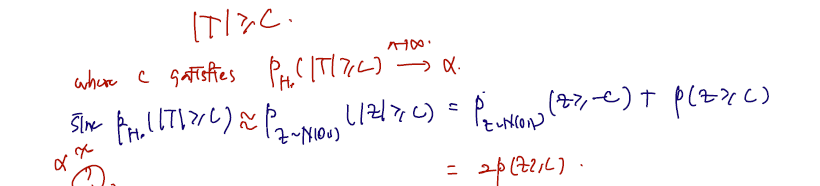 T가 C보다 작다 또는 크냐를 한 번에 묶기 위해 절댓값으로 표기하고, 이것보다 클 때 Reject 한다는 내용을 담으면 된다. 그렇다면 이 영역에서 통계량이 속할 확률을 유의수준 알파라 할 수 있으며, 정규화 이후 N(0,1)에서 C보다 클 확률에 2배를 취한 것이다. 따라서 C가 취하는 분위수도 다음과 같을 것이다.