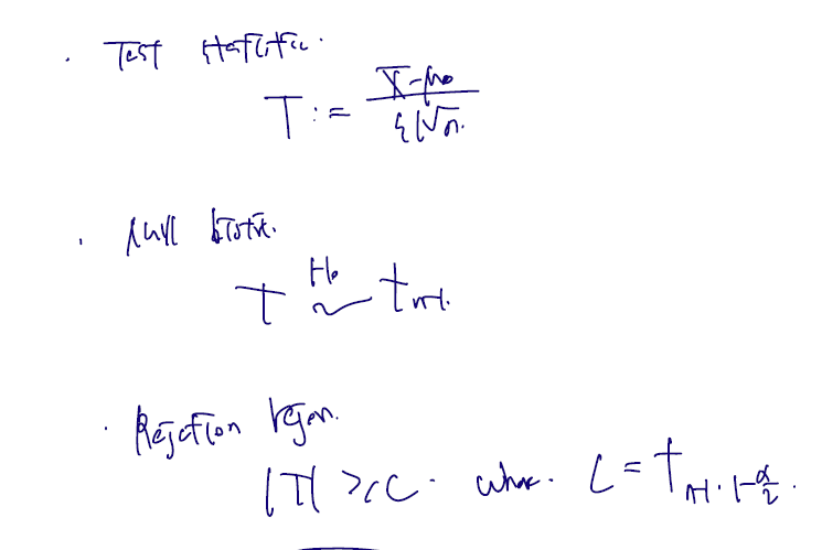 이와 같이 t분포를 사용해서 검정하는 것을 (귀무가설 하 통계량이 t분포를 따름을 보이고 기각역도 여기서 construct 하는 것을) t검정이라 하고, 위의 example 1예시처럼 z분포라면 이를 z검정이라 한다.