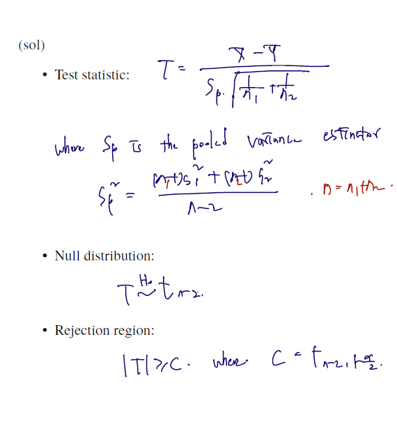 이전에 등분산 이표본에서 모평균 차의 신뢰구간을 구한 때와 비슷한 통계량을 쓴다. pooled variance 를 그대로 갖다 쓰는데, 이는 각 집단의 편차 제곱합을 전체 수로 나눠서 두 이 표본에 대해 둘을 포괄할 수 있는 분산을 계산해내는 방법이었다.) 이 통계량은 자유도 n-2 짜리 t분포를 따랐었고.. 따라서 양측 검정 시 n-2 자유도의 t distribution 에서 rejection region 도 만들어진다.