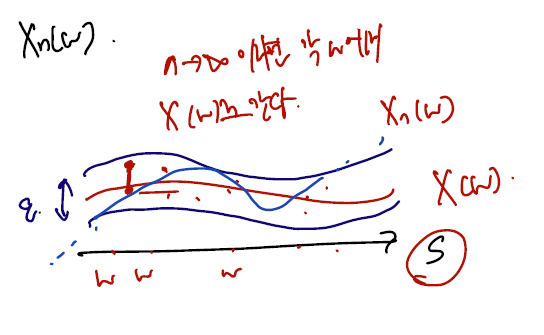 X(w)와 앱실론만큼의 거리 안으로 Xn(w) 이 다 들어온다는 것이며, 이들의 차이가 앱실론을 벗어나는 영역이 0이 된다는 것이다.