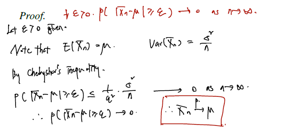 대수의 법칙을 쓰기 위해서는 분포의 모평균과 모분산이 값은 unknown 이더라도 finite 로 존재해야 한다. (평균이 존재하지 않는 분포는? -> 코시분포) 그리고 위의 확률 수렴을 쓰면 어렵지 않게 표본평균이 모평균으로 convergence in probabiliy 함을 보일 수 있다. 이에 대한 증명은 보통 부등식으로, 이미 알려진 부등식 내에서 더 큰 항이 0으로 수렴암을 보여서 작은 target 항 또한 0으로 수렴함을 보이는 게 대부분이다.