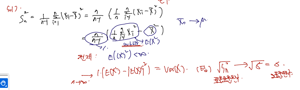 표본분산의 정의로부터 시작하여 각각 WLLN과 in probability 수렴을 쓰면 n이 무한대로 갈 때 모분산으로 수렴함을 보일 수 있다. 각각 E(X2) 로 만들 때 WLLN 가 쓰이고, E(Xˉ)2 를 보일때 Xˉ 가 모평균 뮤로 in probability 수렴함을 쓴다. 이를 통해 n이 무한대로 가면 모분산을 계산하는 form 임을 보일 수 있다. 덤으로, 표본표준편차 또한 모표준편차로 in probability 수렴하게 된다.
