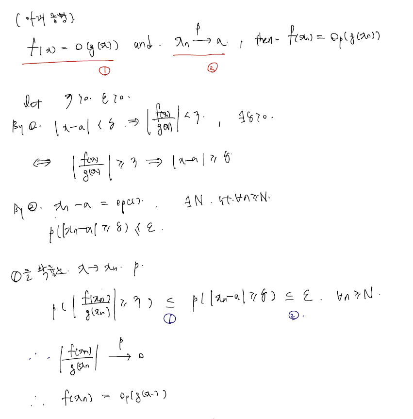 Suppose Xn=op(Yn) and Yn=Op(1). Then Xn=op(1). -> op 안으로 Big-O-p 인 확률 유계가 들어가면 op로이다.